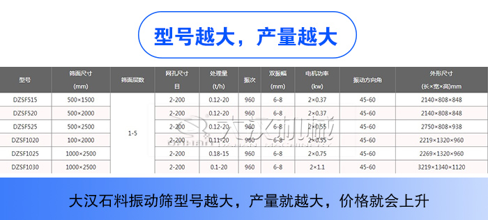 石料直線振動(dòng)篩主要包括DZSF515、DZSF520、DZSF525、DZSF1020、DZSF1025、DZSF1030,不同型號(hào)的石料直線振動(dòng)篩對(duì)應(yīng)的是不同的產(chǎn)量,大漢石料振動(dòng)篩型號(hào)越大,產(chǎn)量就越大,價(jià)格就會(huì)上升。般情況下,每相差個(gè)型號(hào),石料直線振動(dòng)篩價(jià)格就貴1000元左右。