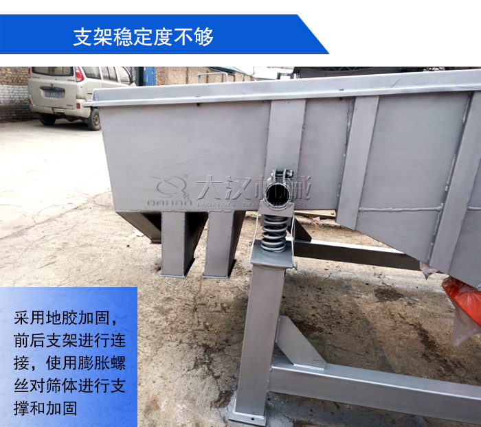 當直線振動篩支架過于簡單,就會導致篩體承受不了足夠的重量,篩機在工作時,其支架穩定性不夠,就會出現左右搖擺的現象??梢圆捎玫啬z加固,前后支架進行連接,使用膨脹螺絲對篩體進行支撐和加固,必要時可采用水泥澆灌,使直線振動篩的作用力作用在地面上。