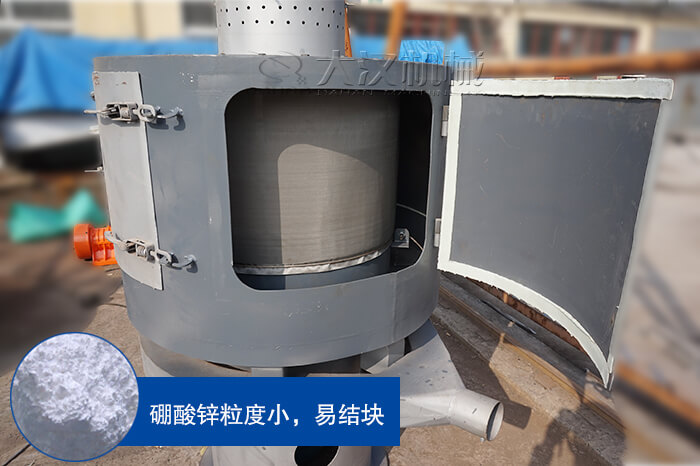 由于硼酸鋅密度般比較小,所以在篩分過程中容易粘在篩網(wǎng)上或造成結(jié)塊,嚴重影響篩分效率和精度,氣流篩風輪葉片的高速旋轉(zhuǎn)可以使結(jié)塊物料被打碎,相當于臺破碎機和臺篩分機的組合,提高了篩分效率。
