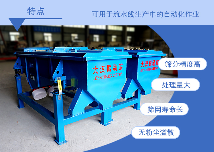 碳鋼直線振動篩結構簡單、耗能少、噪音低、篩網使用壽命長、密封性好、無粉塵溢散、維修方便、可用于流水線生產中的自動化作業。